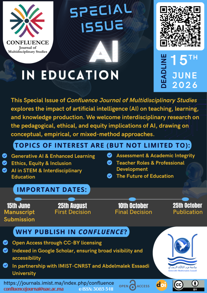 Confluence Journal of Multidisciplinary Studies is an international, peer-reviewed, open-access publication that promotes cross-disciplinary dialogue in the humanities and social sciences, including fields such as language, literature, culture, translation, media, pedagogy, digital technologies, and e-learning. Founded by faculty members of Abdelmalek Essaâdi University, it fills a crucial gap as Morocco’s first English-language academic journal, fostering global scholarly exchange and international research collaboration. Recognized by the Centre National pour la Recherche Scientifique et Technique (CNRST), Confluence is guided by a diverse editorial board spanning multiple continents and publishes biannually, with special issues dedicated to timely themes and regional academic interests.